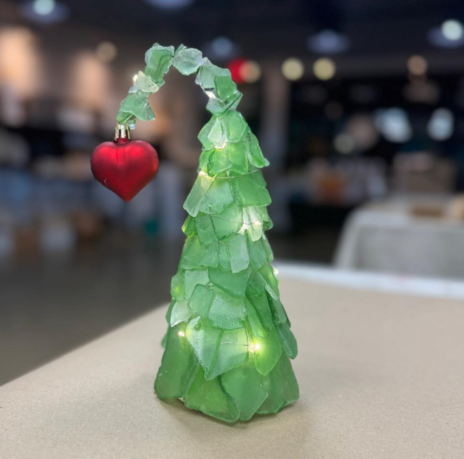 Our Grinchy Tree measures approx. 9" tall with arch and will come with a set of fairy lights and a red heart ornament. There will be an assortment of green and some filler colors (yellow/white) available to make your tree the perfect GRINCHY color at event.